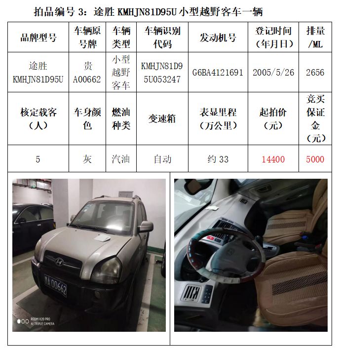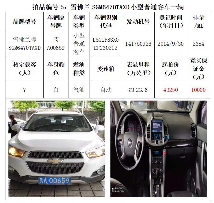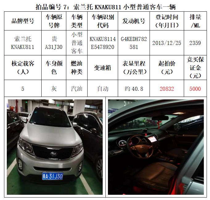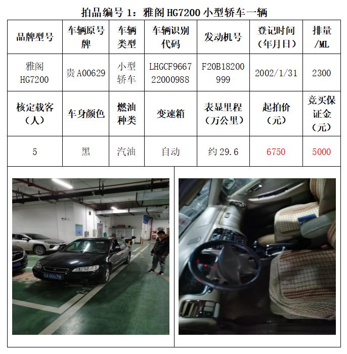 一、拍賣標的:雅閣HG7200小型轎車1輛、別克牌SGM6527AT小型普通客車1輛、途勝KMHJN81D95U小型越野客車1輛、長城牌CC6460KM29小型越野客車1輛、雪佛蘭SGM6470TAXD小型普通客車1輛、尼桑牌ZN6453WAG3小型普通客車1輛,索蘭托KNAKU811小型普通客車1輛,共計7輛車。