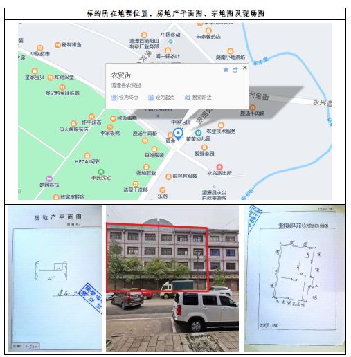 1、標的位于湄潭縣永興鎮煙葉收購站(卷煙銷售部)。房屋所有權證:遵房權證湄潭縣字第4242號,證載建筑面積:906㎡,房屋總層數為4層,混合結構,設計用途為綜合用房;國有土地使用證:湄國用2000字第02-17號,使用權面積為312㎡,使用權類型為出讓,用途為商業。