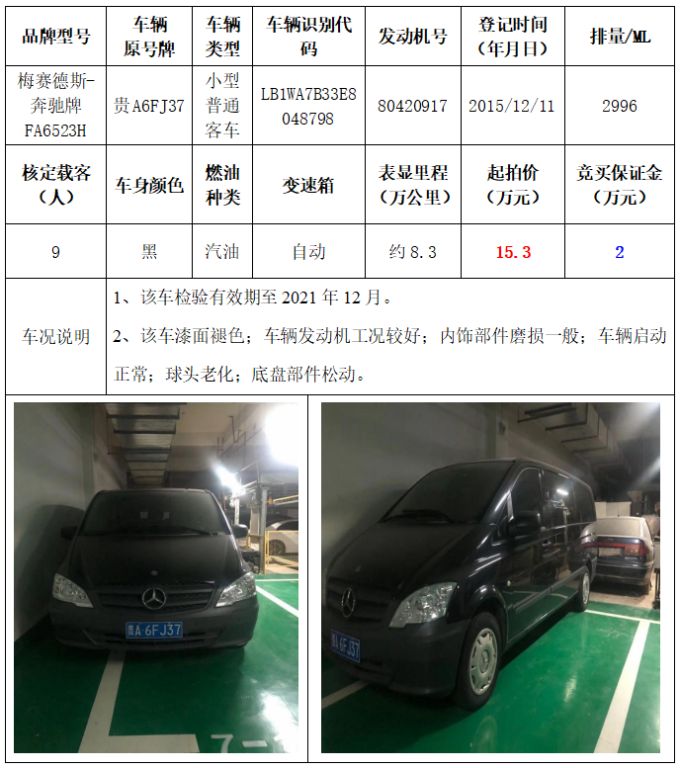 拍品編號2:梅賽德斯-奔馳牌FA6523H小型普通客車(原號牌貴A6FJ37)一輛