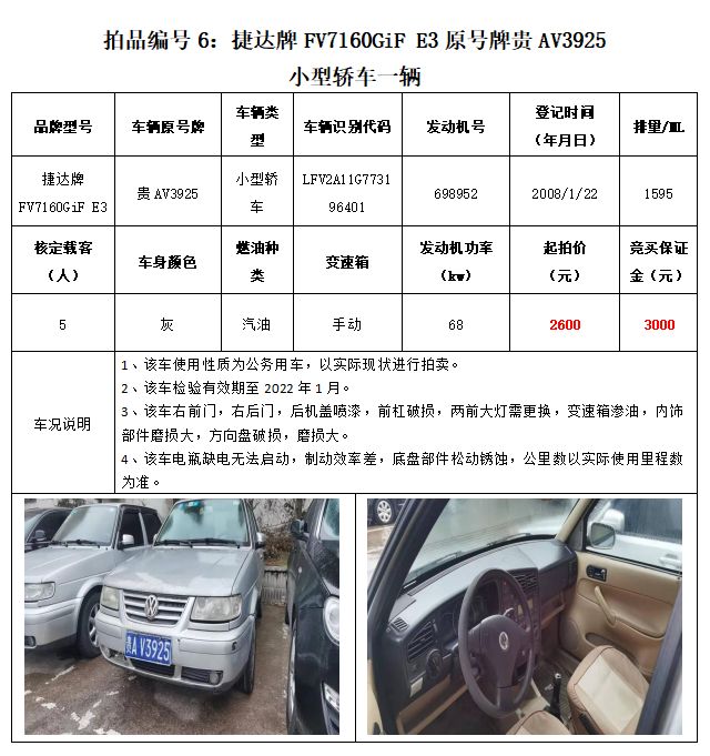 捷達牌FV7160GiF E3小型轎車3輛、榮威牌CSA7181AB小型轎車3輛、帕薩特牌SVW7183MJI小型轎車1輛、別克(BUICK)牌SGM6512GL8小型普通客車1輛、廣州雅閣HG7240轎車1輛、邁騰牌FV7187T小型轎車1輛,共計10輛車。