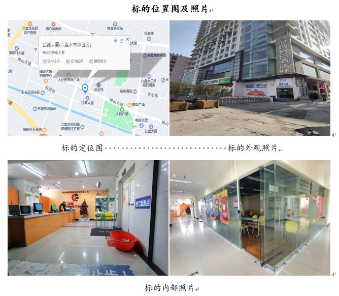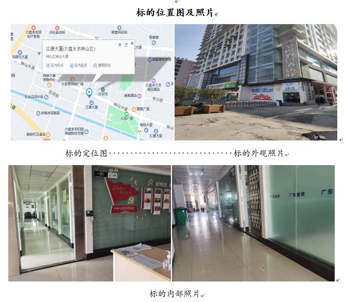 標的位于六盤水市鐘山區鐘山中路江源大廈46號6層601室的商業房地產,建筑面積為1181.04㎡,樓幢總層數為27層,所在樓憧為鋼筋混凝土結構,建成于2010年。