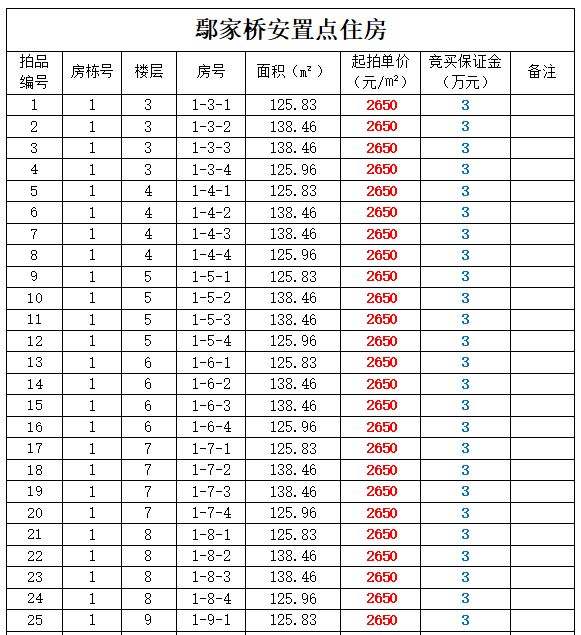 1、鄢家橋安置房住房257套,建筑面積:91.09㎡-138.46㎡,起拍單價:2650元/㎡;
