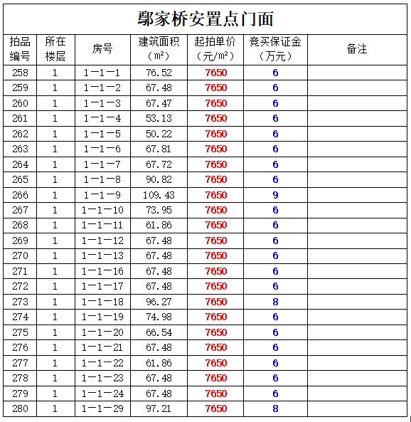拍品編號258-325號:鄢家橋安置房門面(共計68間)