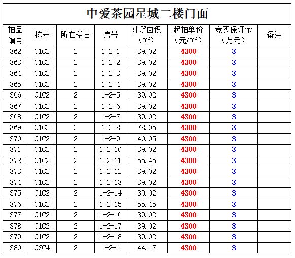 4、中愛茶園星城二樓門面66間,建筑面積:38.28㎡-138.2㎡,起拍單價:4300元/㎡;