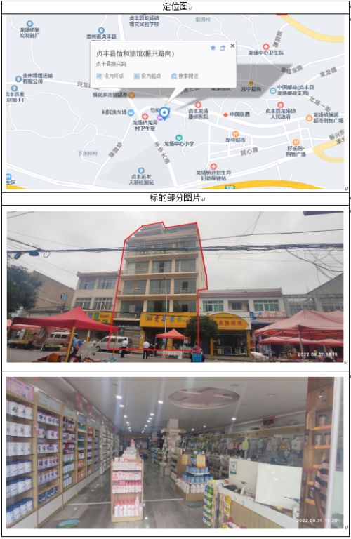標的位于貞豐縣龍場鎮興龍商貿區,房屋總層數為6層。產權證號:貞房權證龍場鎮字第20120349號、貞國用2012第004022號,房屋證載建筑面積2278.03㎡(實測面積2263.59㎡),其中商用建筑面積:1818.71㎡,住宅建筑面積:459.32㎡;規劃用途為商住,混合結構。證載土地面積1152㎡(實測面積1183.74㎡),地類用途為商住,使用權類型為出讓,土地使用權終止日期為2058年9月6日。