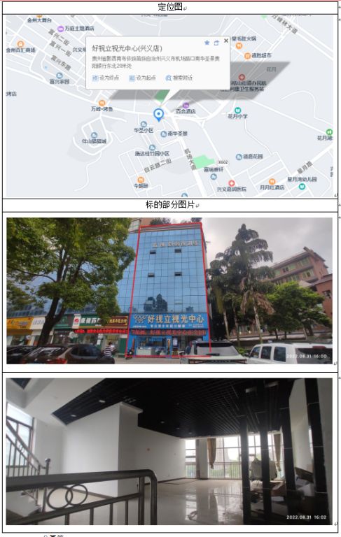 1、標的位于興義市民航大道南華圣景4幢107號房屋,房屋總層數為16層,標的所在層數為1-4層。產權證號:黔(2018)興義市不動產權第0016025號,房屋證載建筑面積438.56㎡(專有建筑面積:402.24㎡,分攤建筑面積:36.32㎡。每層房屋建筑面積均為109.64㎡),規劃用途為商業服務,框架結構。