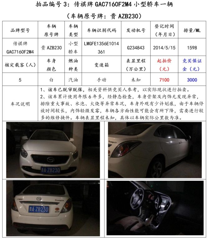 拍品編號3:傳祺牌GAC7160F2M4小型轎車一輛(車輛原號牌:貴AZB230);