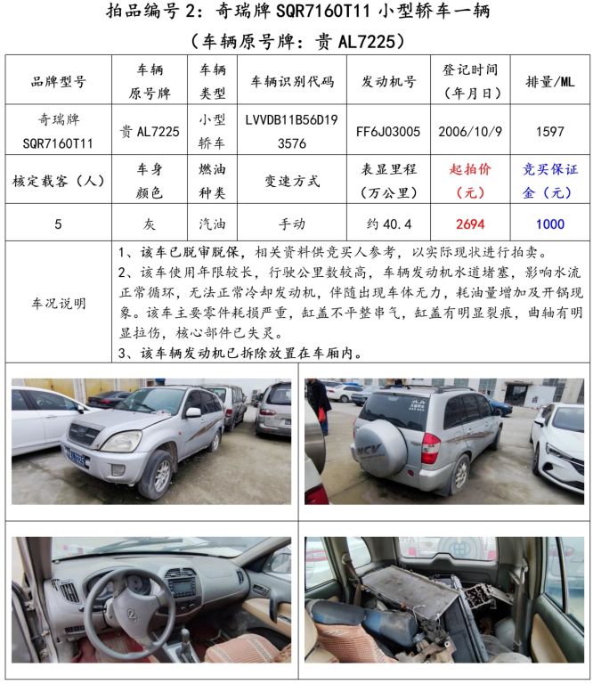 拍品編號2:奇瑞牌SQR7160T11小型轎車一輛(車輛原號牌:貴AL7225);