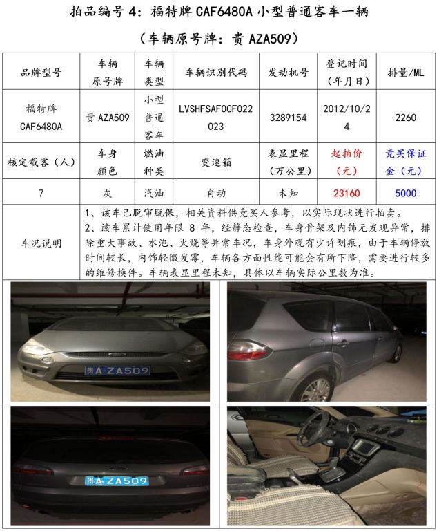 拍品編號4:福特牌CAF6480A小型普通客車一輛(車輛原號牌:貴AZA509);