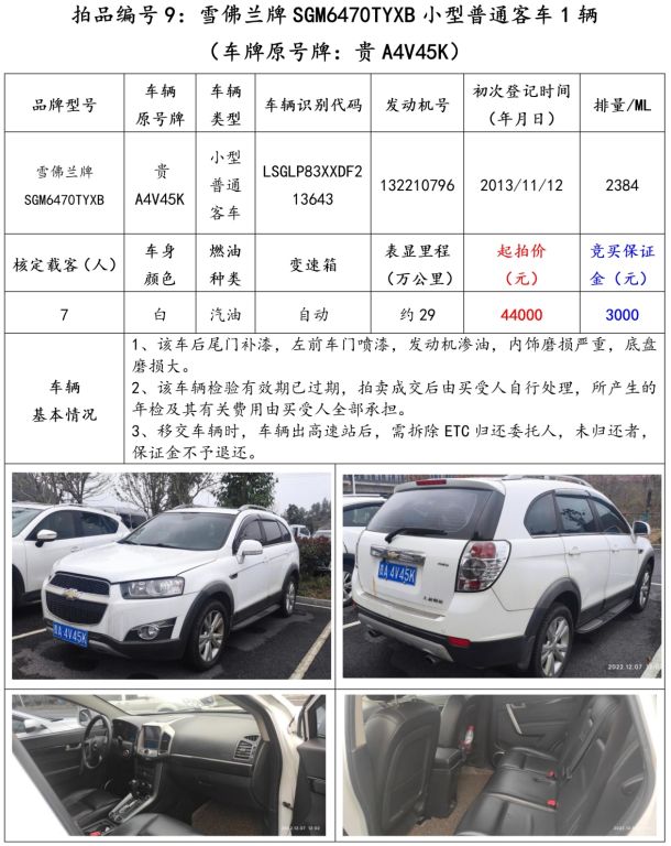 拍品編號9:雪佛蘭牌SGM6470TYXB小型普通客車1輛(車牌原號牌:貴A4V45K)。