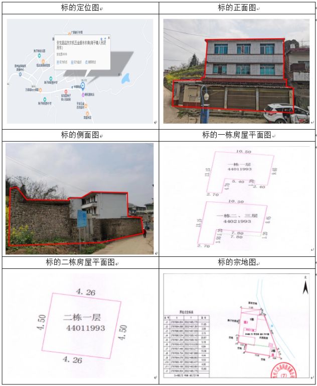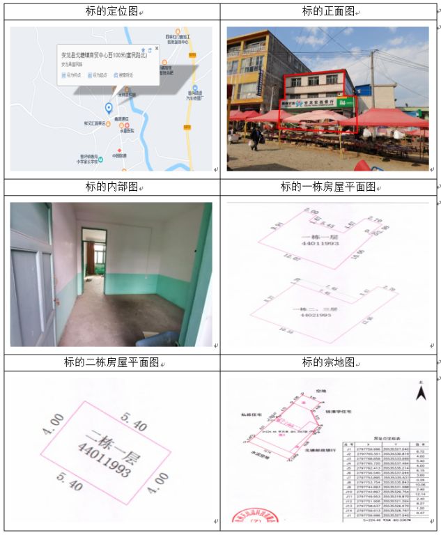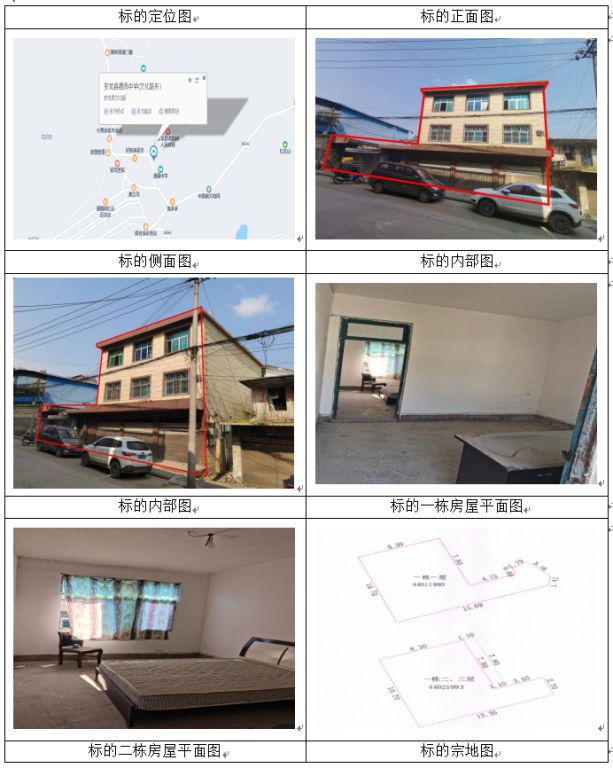 標的坐落于安龍縣普坪鎮新街村場壩,房屋總層數3層,實測建筑總面積:401.14㎡,其中1幢1-3層證載建筑面積:359.25㎡,2幢1層證載建筑面積:34.07㎡,房屋產權證號:安房權證普坪鎮字第00003461號,設計用途分別為辦公住宅、住宅,混合結構;土地使用權證號:安國用(2014)第12號,證載土地使用權面積:235.94㎡,實測土地使用權面積235.94㎡,地類(用途)金融用地,使用權類型為出讓,終止日期為2054年11月22日止。