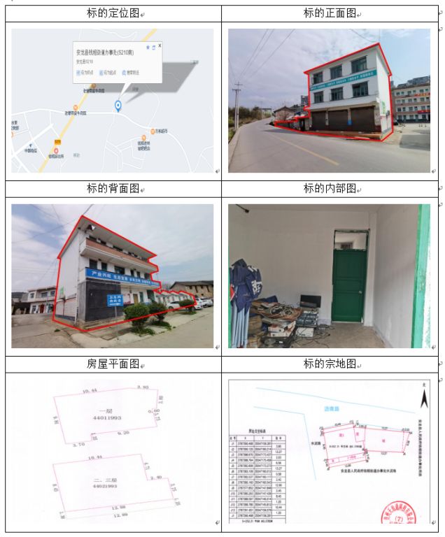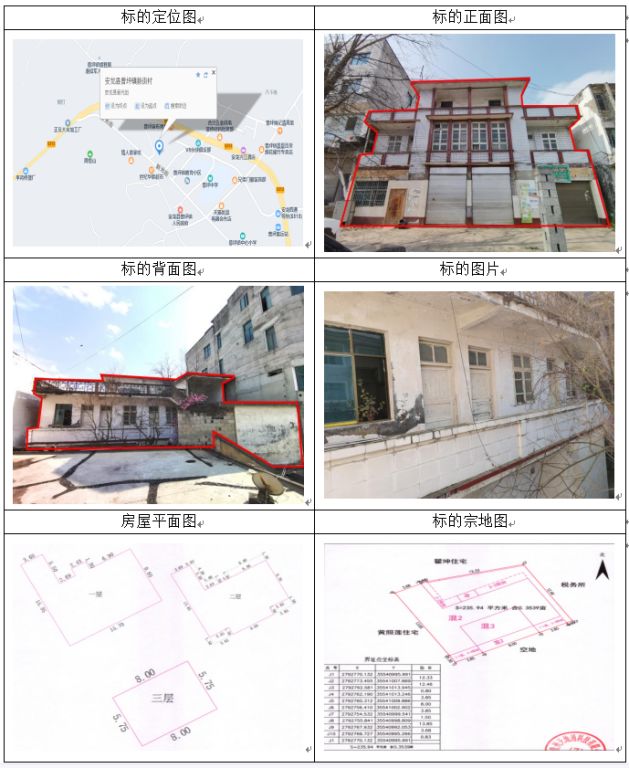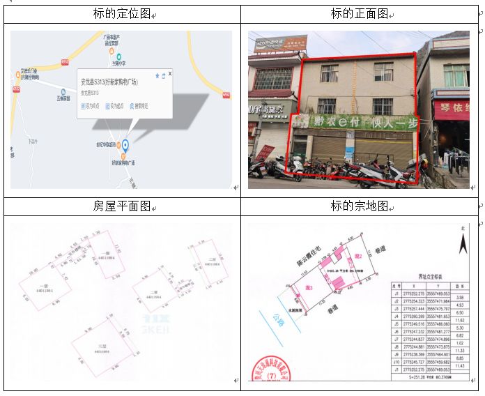 標的坐落于安龍縣新橋鎮新橋居委會,房屋總層數3層,其中1幢1-3層證載建筑面積:312.26㎡,實測建筑面積:338.52㎡,2幢1層證載建筑面積:10.81㎡,實測建筑面積:9㎡,3幢1層證載建筑面積:9.72㎡,實測建筑面積:10.42㎡,房屋產權證號:安房權證新橋鎮字第00003462號,設計用途分別為辦公住宅、其它,混合結構;土地使用權證號:安國用(2014)第20號,證載土地使用權面積:443.24㎡,實測土地使用權面積443.24㎡,地類(用途)金融用地,使用權類型為出讓,終止日期為2054年11月22日止。