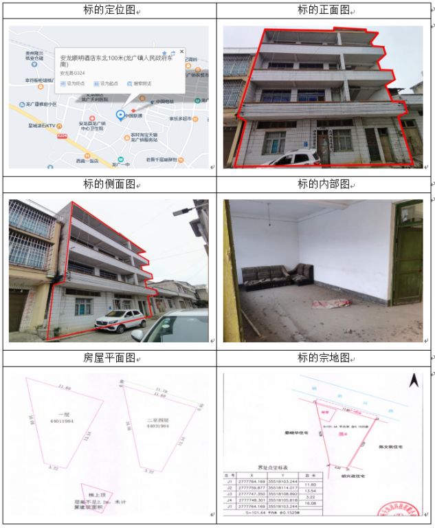 標的坐落于安龍縣龍廣鎮南環路,房屋總層數4層,證載建筑面積:453.34㎡,實測建筑面積:423.42㎡,房屋產權證號:安房權證龍廣鎮字第00003464號,設計用途為住宅,混合結構;土地使用權證號:安國用(2014)第11號,證載土地使用權面積:98.7㎡,實測土地使用權面積:101.64㎡,地類(用途)住宅用地,使用權類型為出讓,終止日期為2054年11月22日止。