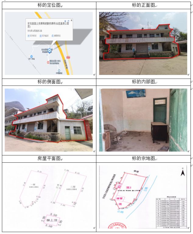 標的坐落于安龍縣海子鄉海子村海二組,房屋總層數3層,其中1幢1-3層證載建筑面積:319.19㎡,實測建筑面積:316.5㎡,2幢1層證載建筑面積:17.11㎡,實測建筑面積:19.17㎡,房屋產權證號:安房權證海子鄉字第00003470號,設計用途分別為辦公住宅、其它,混合結構;土地使用權證號:安國用(2014)第18號,證載土地使用權面積:476.74㎡,實測土地使用權面積480.72㎡,地類(用途)金融用地,使用權類型為出讓,終止日期為2054年11月22日止。