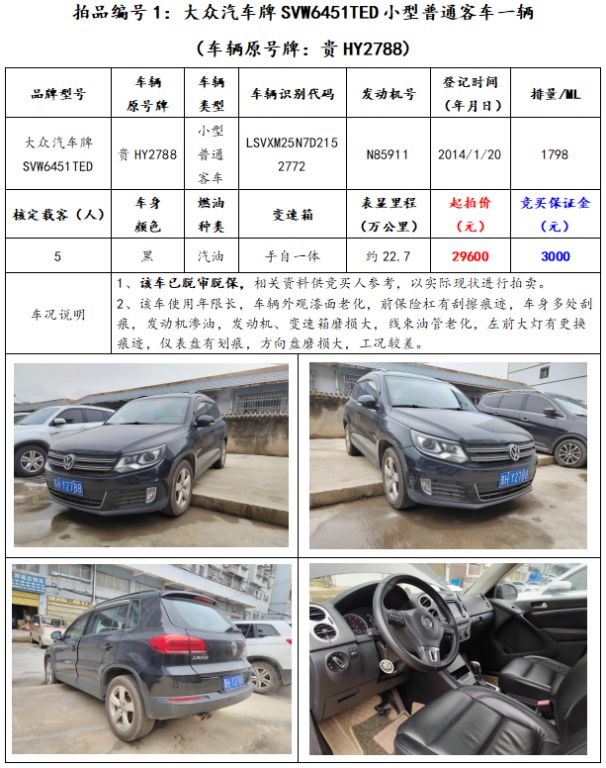 拍品編號1:大眾汽車牌SVW6451TED小型普通客車一輛(車輛原號牌:貴HY2788);