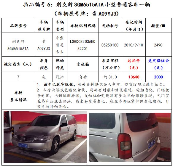 拍品編號6:別克牌SGM6515ATA小型普通客車一輛(車輛原號牌:貴A09YJ3);