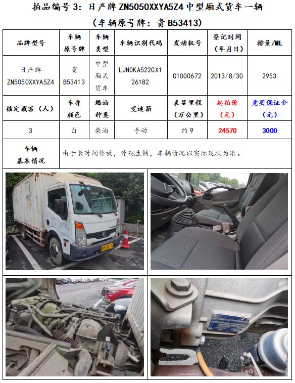 拍品編號3:日產牌ZN5050XXYA5Z4中型廂式貨車一輛(車輛原號牌:貴B53413);