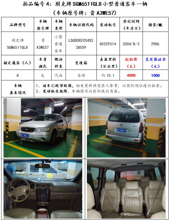 拍品編號4:別克牌SGM6511GL8小型普通客車一輛(車輛原號牌:貴A3WE57);