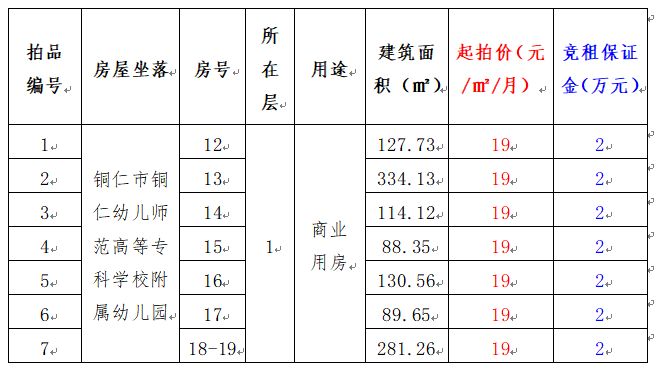 拍品編號1-7號:銅仁幼兒師范高等專科學校附屬幼兒園12至19號商業用房房地產