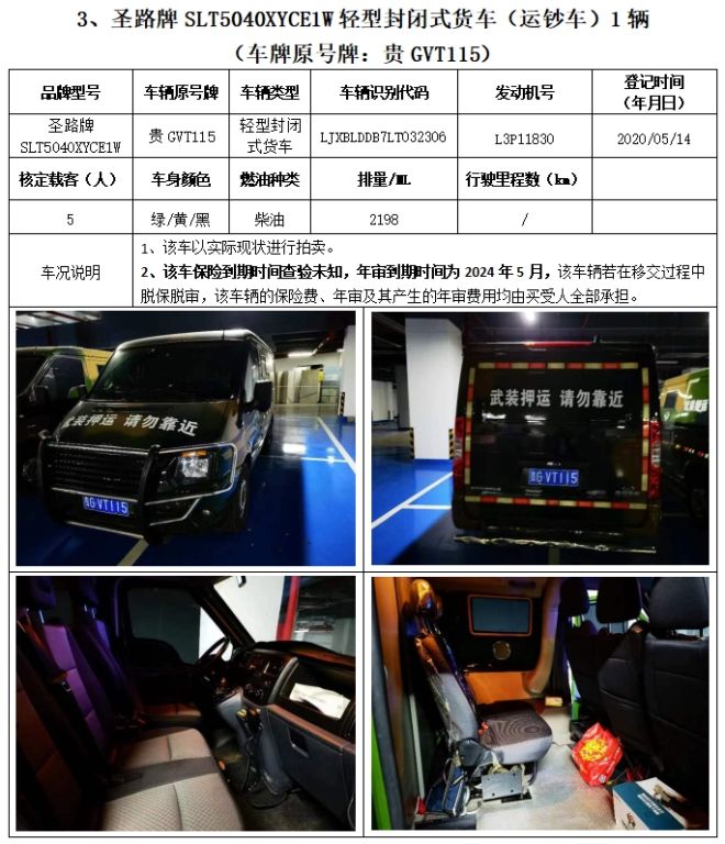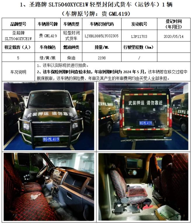 拍品編號1:圣路牌SLT5040XYCE1W輕型封閉式貨車(運鈔車)3輛、圣路牌SLT5042XYCEIL小型專用客車(運鈔車)1輛,共4輛,整體拍賣