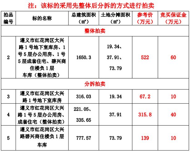 標的:遵義市紅花崗區大興路1號地下室庫房、1號5層辦公用房、1號5層成套住宅、碧興商住樓負1層車庫