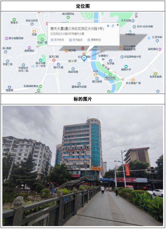 6、遵義市紅花崗區大興路1號(碧天大廈)地下室、五層,遵義市紅花崗區大興路碧興商住樓負一層,位于遵義市紅花崗區老城區,兩棟房屋相鄰,中間隔一條小街。周邊有中國農業銀行、遵義會議會址,遵義市第十一中學,遵義市朝陽小學,百盛購物中心,百貨大樓,鳳凰山公園等,公共服務設施較完備。