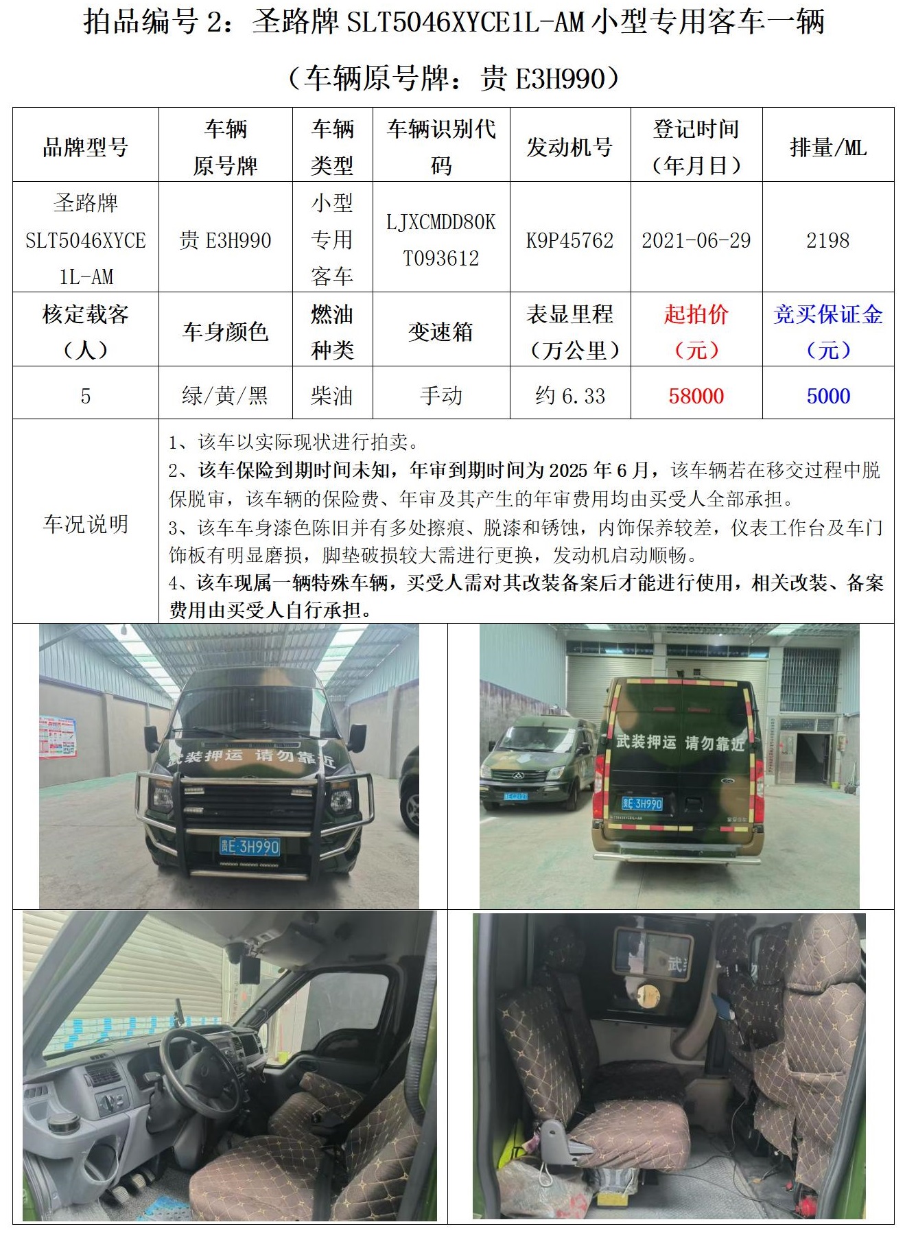 2、圣路牌SLT5046XYCE1L-AM小型專用客車1輛;
