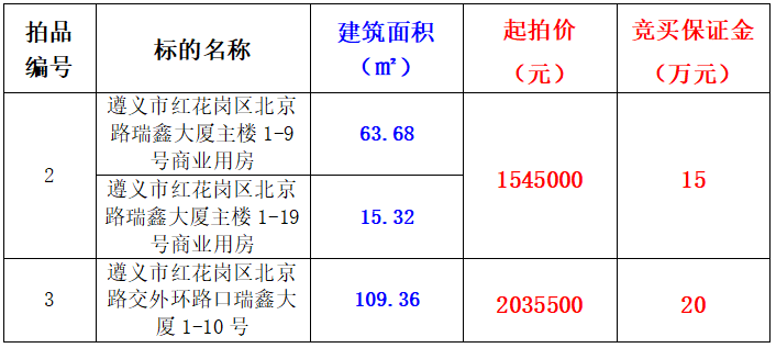 2、遵義市紅花崗區北京路瑞鑫大廈主樓1-9、1-19號商業用房(整體拍賣),建筑面積:79㎡,起拍價:1545000元,競買保證金:15萬元;