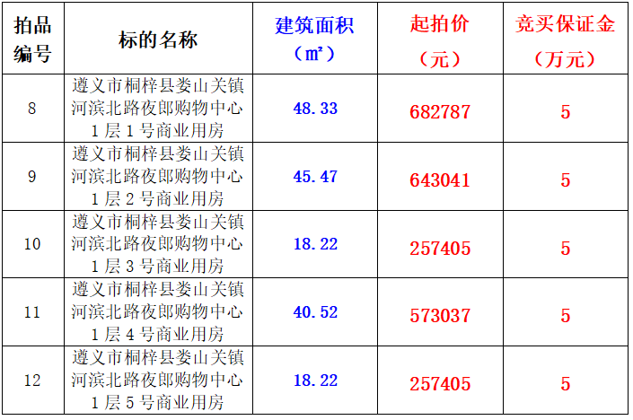 12、遵義市桐梓縣婁山關鎮河濱北路夜郎購物中心1層5號商業用房,建筑面積:18.22㎡,起拍價:257405元,競買保證金:5萬元;