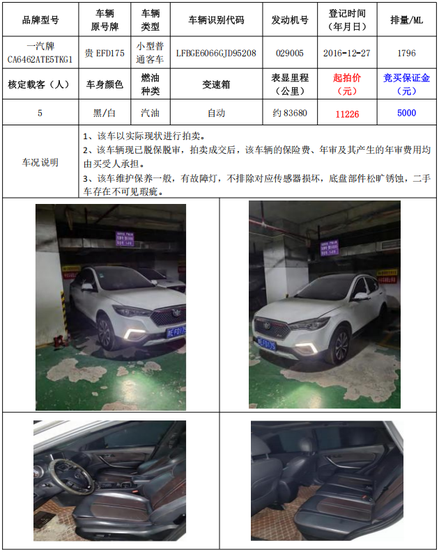 拍品編號2:一汽牌CA6462ATE5TKG1小型普通客車1輛(車輛原號牌:貴EFD175)