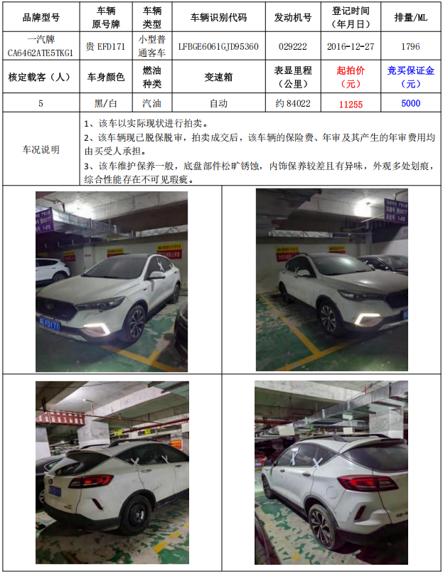拍品編號1:一汽牌CA6462ATE5TKG1小型普通客車1輛(車輛原號牌:貴EFD271)